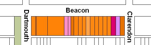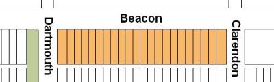 The block on the south side of Beacon between Clarendon and Dartmouth is 548 feet in length and 112 feet from Beacon to Alley 419.