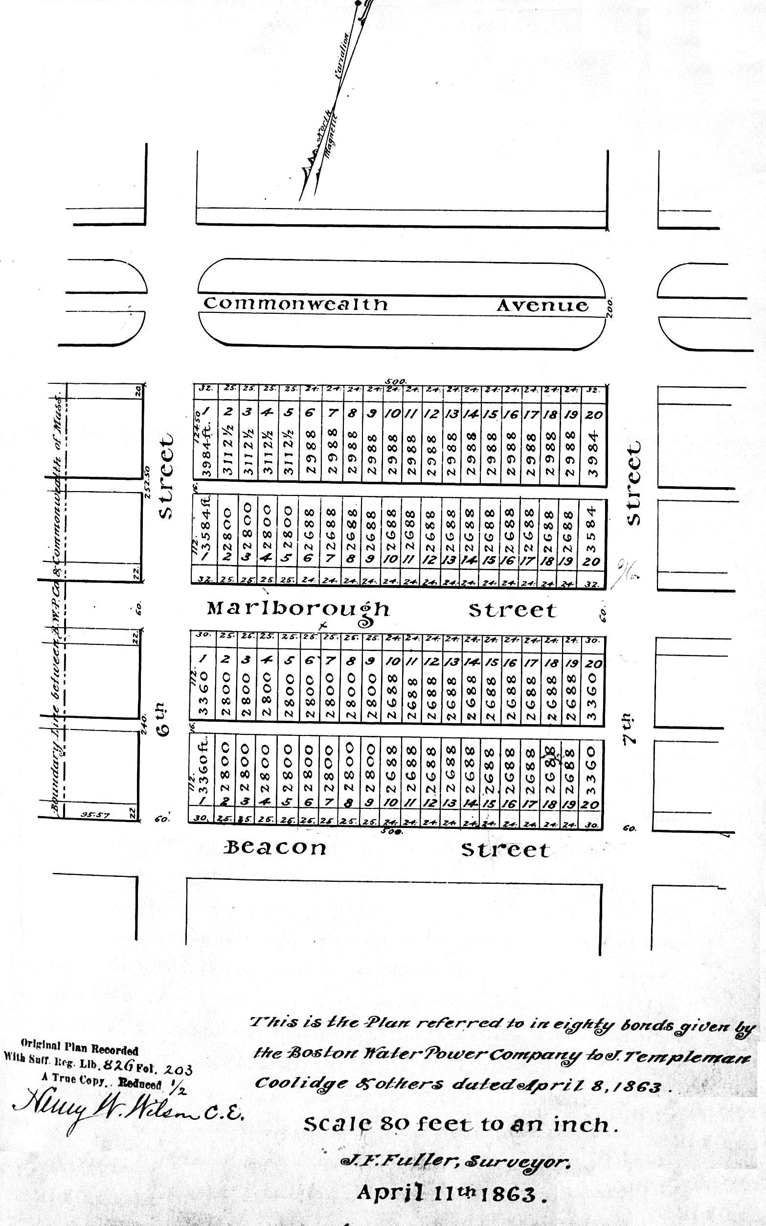 On April 15, 1863, the Boston Water Power Company entered into an agreement to sell all of its land between Fairfield and Gloucester on the south side of Beacon, north and south sides of Marlborough, and north side of Commonwealth to a real estate investment trust formed by John Templeman Coolidge, Franklin Evans, and Charles Henry Parker. The company subdivided the parcels into eighty lots (twenty per block), as shown on an April 11, 1863, plan prepared by J. F. Fuller, and issued individual deed bonds to the trustees, securing their right to purchase each lot. On January 29, 1866, the trustees paid for and took title to all of the land.