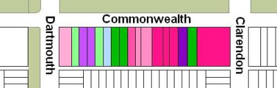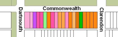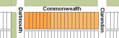 The block on the south side of Commonwealth between Clarendon and Dartmouth is 548 feet in length and 124 feet 6 inches from Commonwealth to Alley 435.