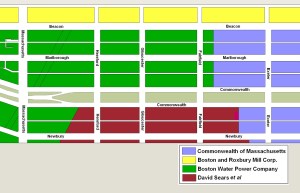 The land was part of the area owned by the David Sears family. Their lands extended south from a line down the middle of Commonwealth, bounded on the east by the Commonwealth’s lands (the boundary was 262 feet west of Exeter, at about where the western wall of 214 Commonwealth is today) and on the west by the Boston Water Power Company’s lands, by a line that ran southwest at approximately a 45 degree angle from a point on the south side of Commonwealth 134.66 feet west of Hereford (324 Commonwealth straddles the line). The Sears family land extended south by an irregular line past Boylston to about St. James Street.