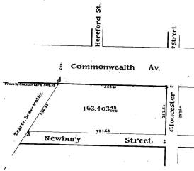 On January 2, 1871, the Sears family sold all of its land the Nathan Matthews (Book 1029, p. 233), including land on the south side of Commonwealth bounded on the east by the Commonwealth’s lands at a point 262 feet west of Exeter and bounded on the west by the Boston Water Power Company’s lands by a line that ran southwest at approximately a 45 degree angle, starting at a point on the south side of Commonwealth 134.66 feet west of Hereford. The land extended south by an irregular line past Boylston to about St. James Street.