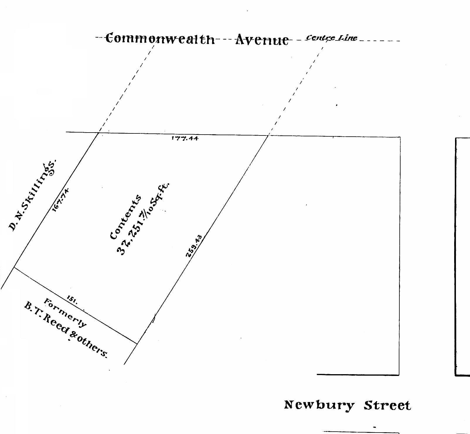 | 324-338 Commonwealth | 16Dec1870 | 177.44’ | David N. Skillings, trustee, for himself, Lawrence Barnes, Charles Whitney, and David Whitney, Jr. | 1032 | 98 |
