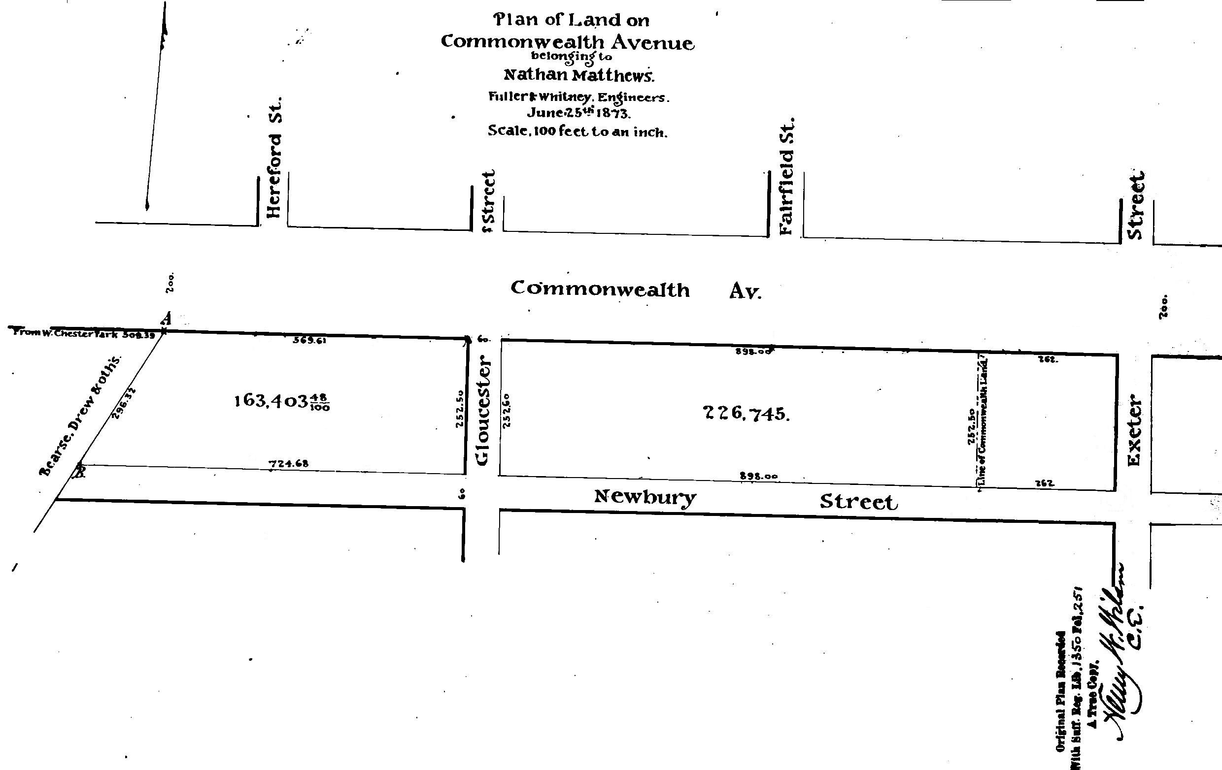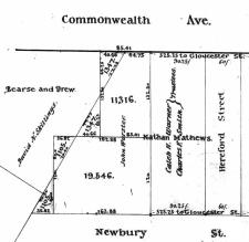 Nathan Matthews was conveyed the land between Gloucester and the boundary with the Boston Water Power Company. The parcel ran between the south side of Commonwealth and the north side of Newbury (including the land where the alleys later would be laid out and the 60 foot wide parcel where Hereford Street later would be located). The parcel had a frontage of 569.61 feet on the south side Commonwealth and 724.68 feet on the north side of Newbury.