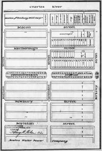 The July 7, 1859, deed to the City of Boston (Suffolk Co. Deed Registry, Book 760, p. 272) and the July 30, 1862, deed to David Snow (Book 831, p. 22) specified that any building on the land was to be “at least three stories high for the main part thereof and shall not in any event be used for a stable, or for any mechanical or manufacturing purposes;” that the front walls were to be set back twenty-two feet from Marlborough, with “steps, windows, porticos, and other usual projections appurtenant thereto” allowed in the reserved space; and that “no cellar or lower floor of any building shall be placed more than four feet below the level of the mill-dam, as fixed by the top surface of the hammered stone at the south-easterly corner of the emptying sluices.” The deeds also provided that the owners of the land would have the right to “plant and cultivate trees on the side walks” in front of their land provided that they left a distance of ten feet between the front boundary of their lots and the trees.