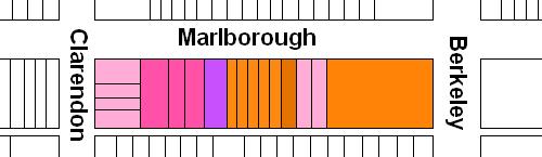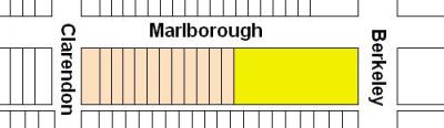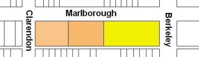 The block on the south side of Marlborough between Berkeley and Clarendon is 548 feet in length and 112 feet from Beacon to Alley 423.