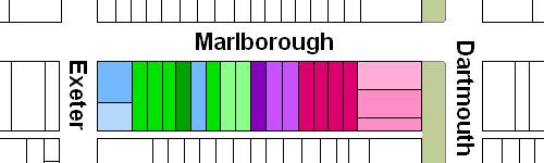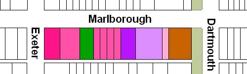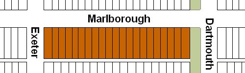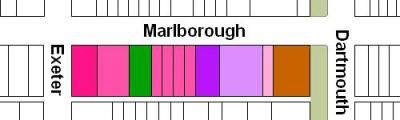 The block on the south side of Marlborough between Dartmouth and Exeter is 528 feet in length and 112 feet from Marlborough to Alley 425.