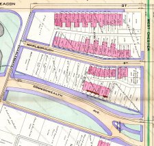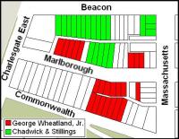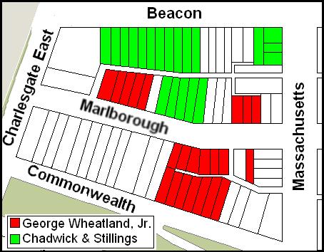 By mid-1888, dwelling houses had been built on much Beacon and Marlborough, primarily on land developed by George Wheatland, Jr., and Chadwick & Stillings. On Commonwealth, the only homes built were those constructed by George Wheatland, Jr.