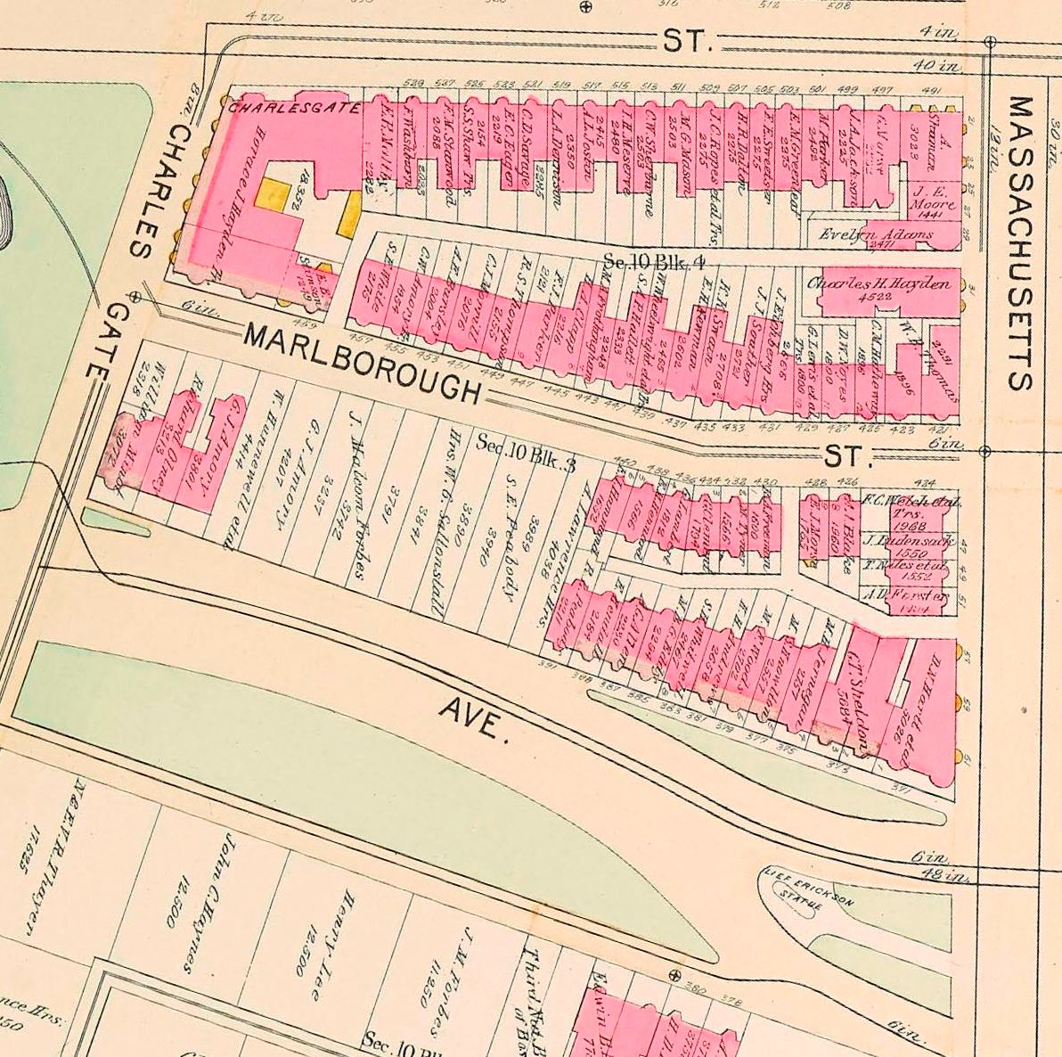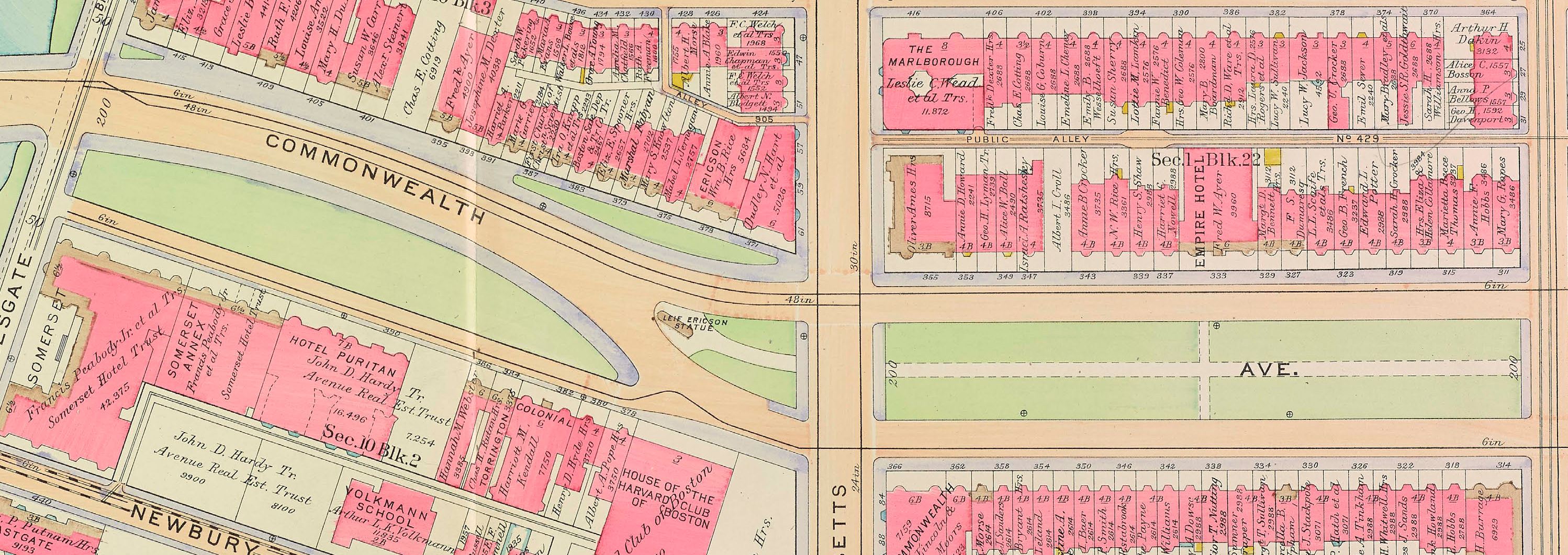 As of January 1, 1885, all of the land was held by three owners: Henry Lee and his partners owned the eastern portion, Henry M. Whitney owned the central portion, and the Commonwealth Avenue Lands Trust owned the western portion.