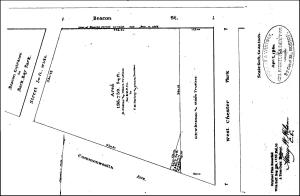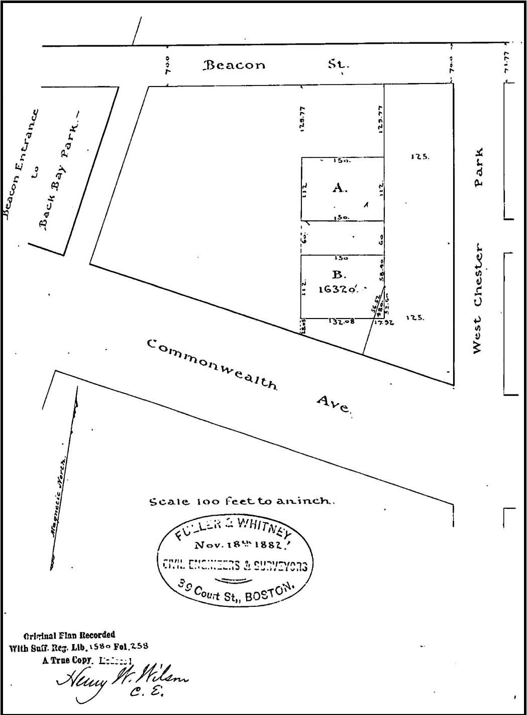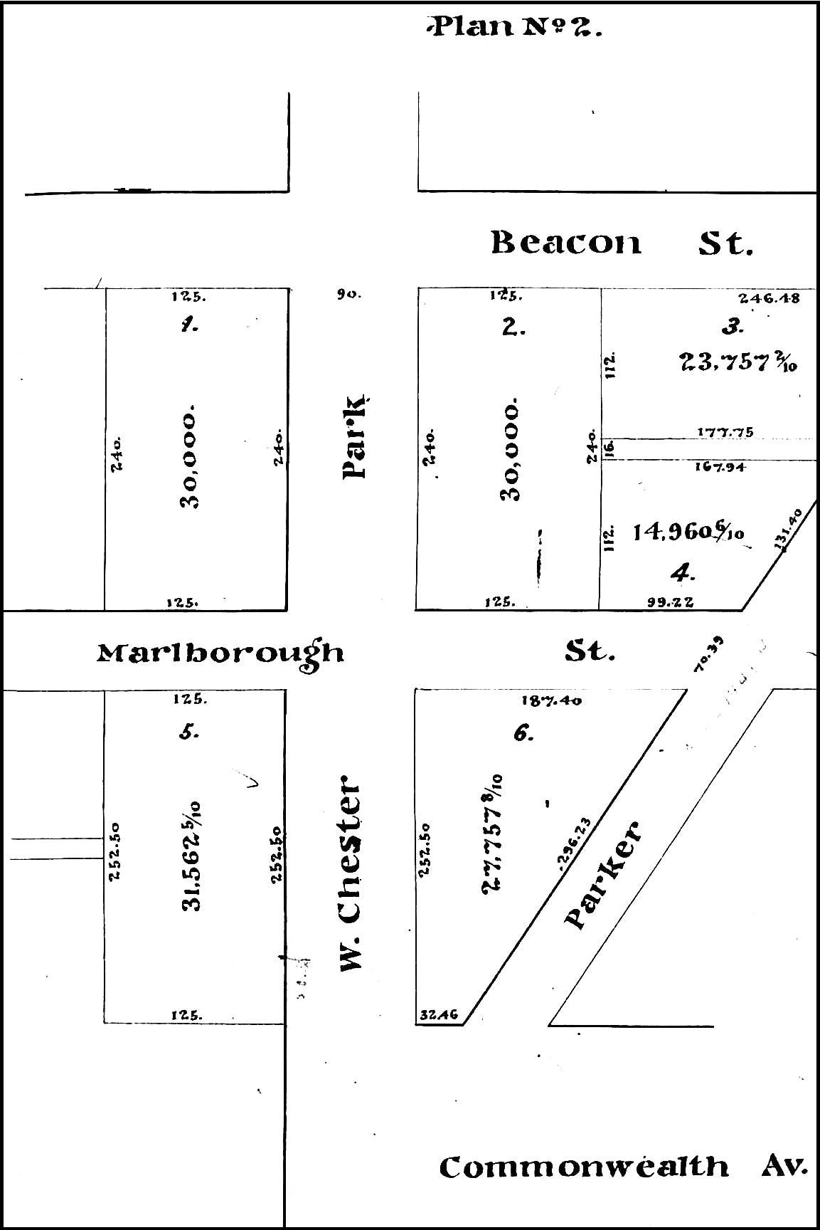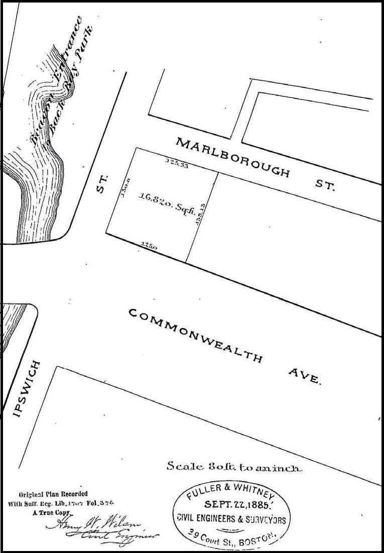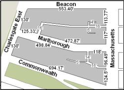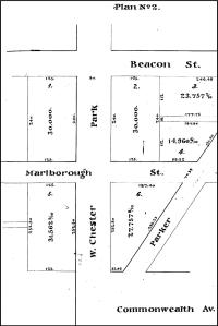 At the time of the sale, the land had not yet been filled and graded and neither Commonwealth nor Marlborough had been extended beyond Massachusetts Avenue (West Chester Park). It was assumed that both streets would extend west in a straight line. The parcel therefore was rectangular in shape, with a 125 foot frontage on Beacon, a 508.5 foot frontage on Massachusetts Avenue (including the width of where Marlborough was expected to run), and a 125 foot frontage on what was assumed to be the northern boundary of where Commonwealth would run.