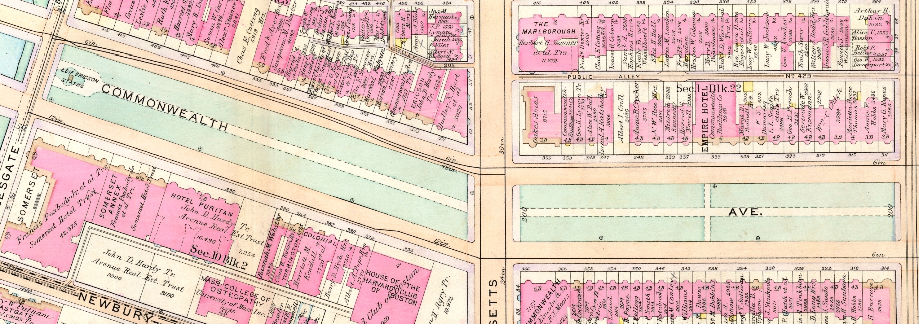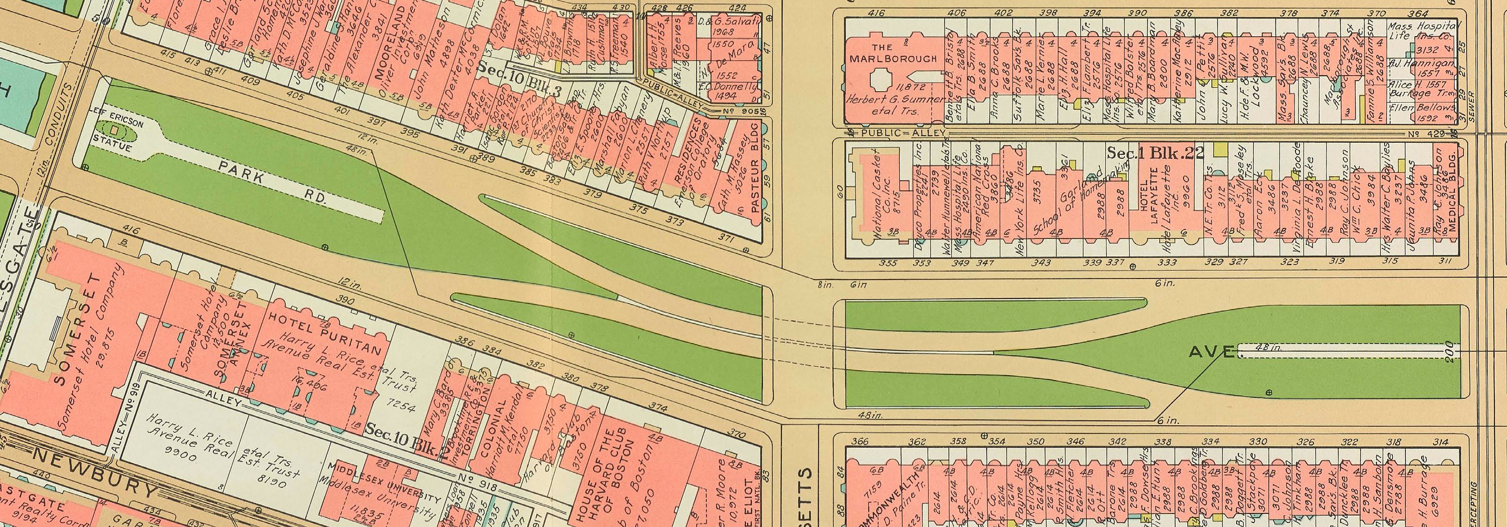 Although the Commonwealth Avenue Lands Trust had sold its holdings on Charlesgate East and on Commonwealth, the property remained vacant. Henry Lee and his partners continued to own all of their vacant land on Commonwealth (371-377 Commonwealth) and on Massachusetts Avenue (491 Beacon, 27-29-31 Massachusetts Avenue, 421-423 Marlborough, 424 Marlborough, 47-49-51 Massachusetts Avenue).