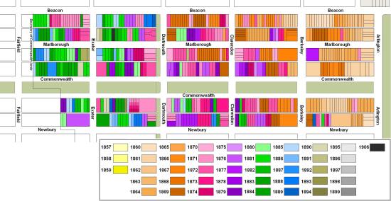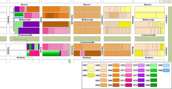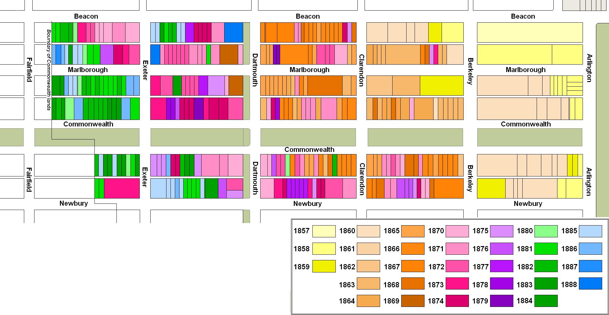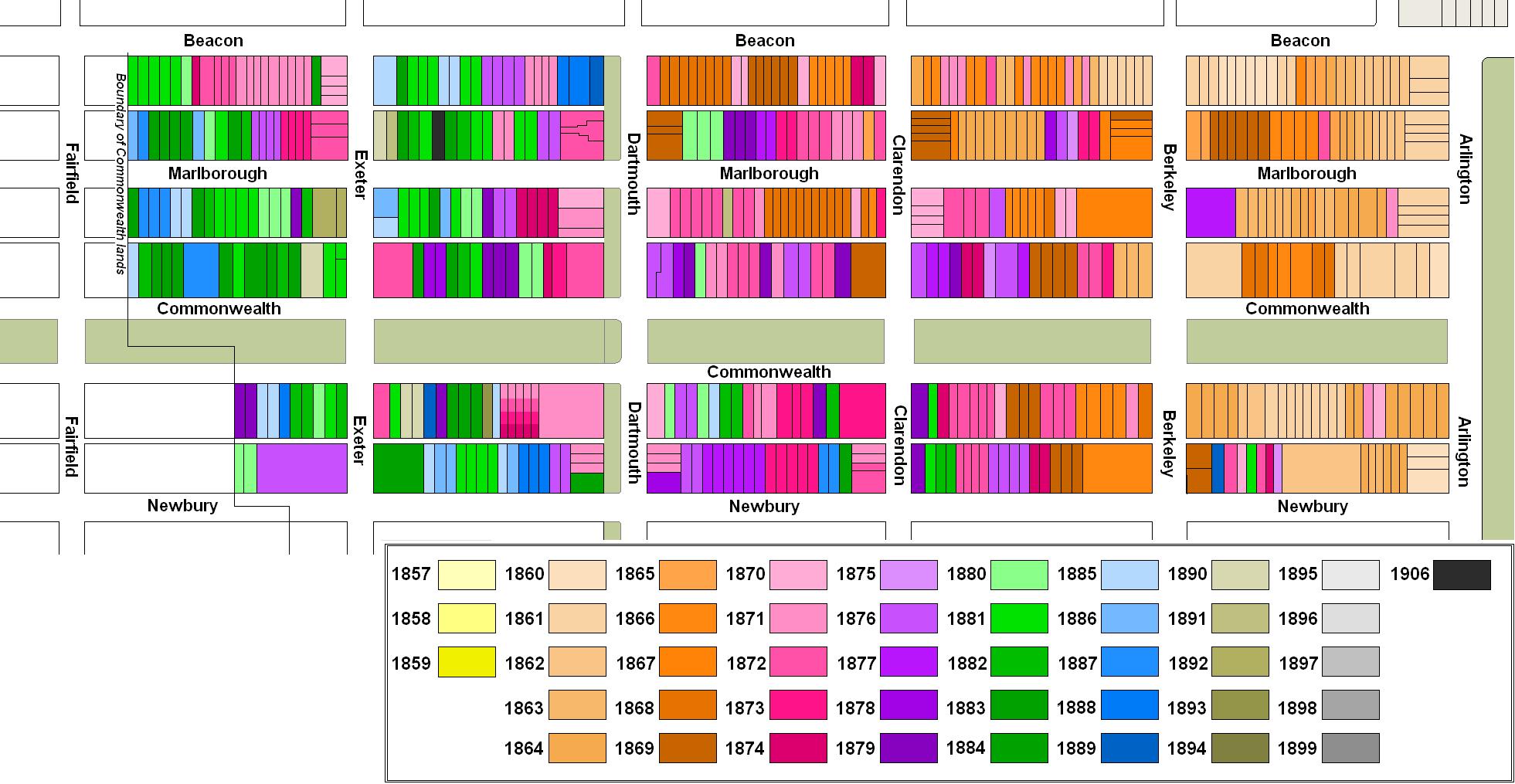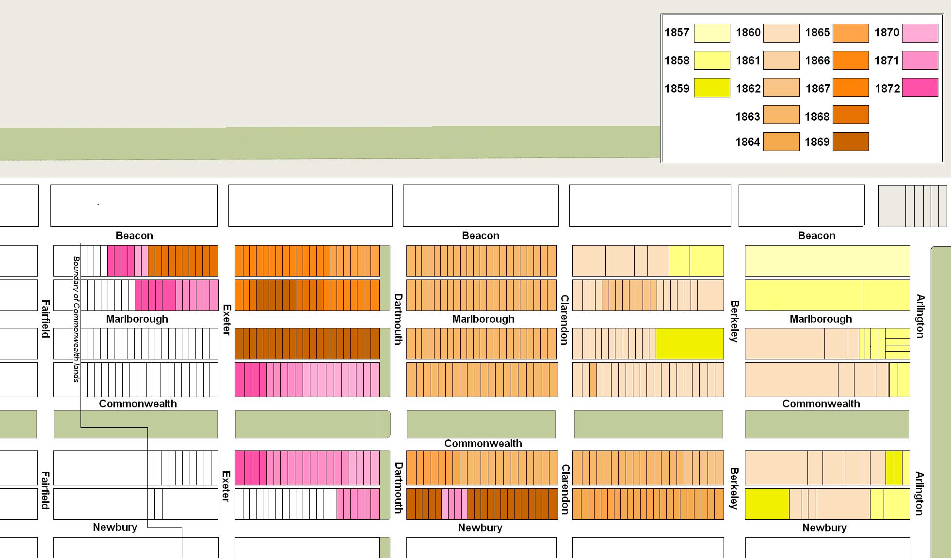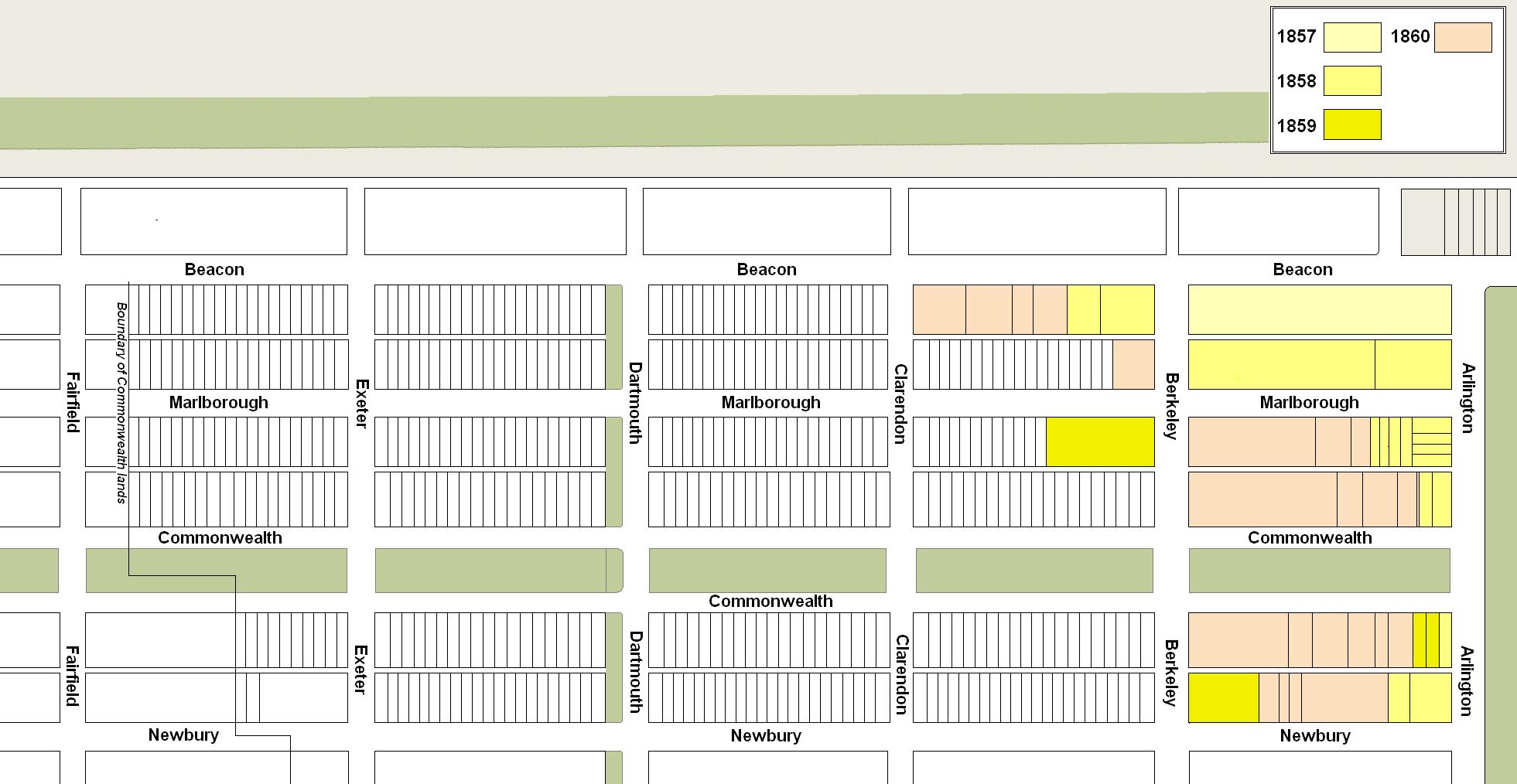 Through these auctions, the Commonwealth sold most of its land in the residential portion of the neighborhood, with the only land remaining unsold being at the western edge of its holdings, in the blocks between Exeter and Fairfield on Beacon, Marlborough and Commonwealth, and in the blocks between Dartmouth and Fairfield on the north side of Newbury.