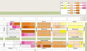 The maps below illustrate the years when property was sold either by private agreement or at public auction, the years in which the property was conveyed by deed by the Commonwealth, and the years in which buildings were first constructed on the land.