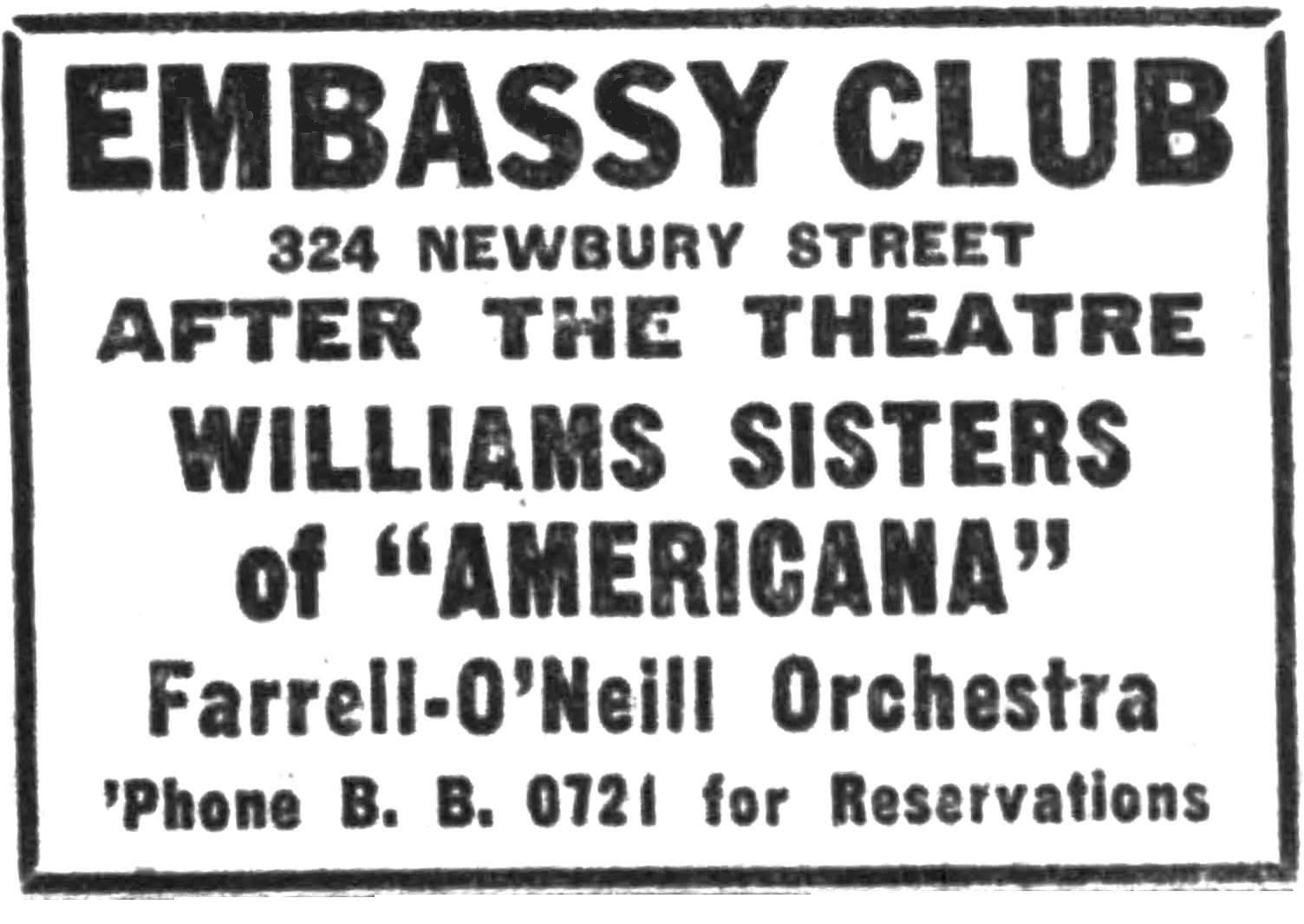 By 1928, 324 Newbury had become the Embassy Club, a night club open to the public, and by 1930 the Rendezvous, which was raided on April 8, 1930, and padlocked because it was found to be serving alcohol in violation of Prohibition.