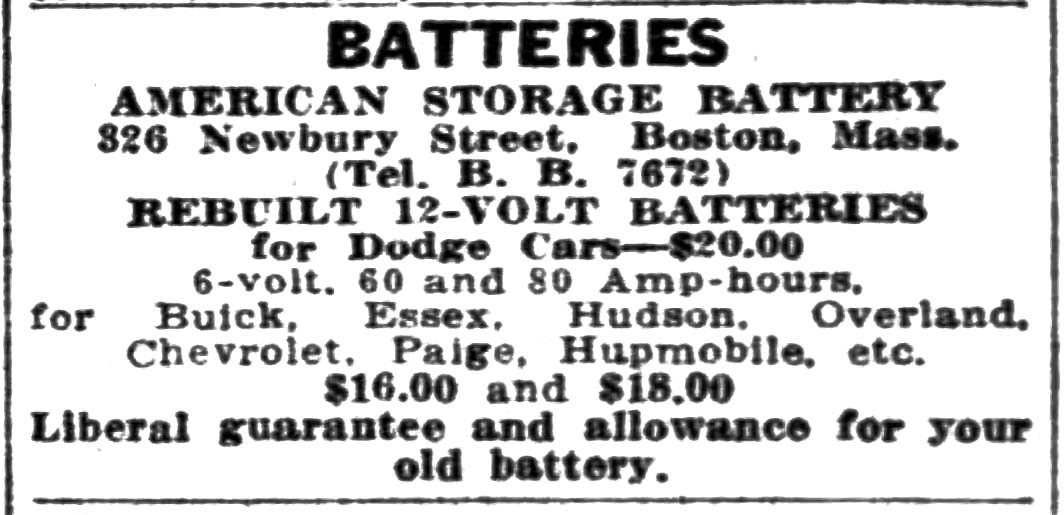 In September of 1916, 326 Newbury was acquired from Albert Bigelow by the Old Dominion Copper Mining and Smelting Company, and in January of 1918 it was acquired from the company by James R. Taylor, treasurer of the American Storage Battery Company. In February of 1918, he filed for (and subsequently received) permission to convert the building into a factory to manufacture automobile storage batteries, the application specifying that “no cars will be run into the building it being a factory and not a service station.”