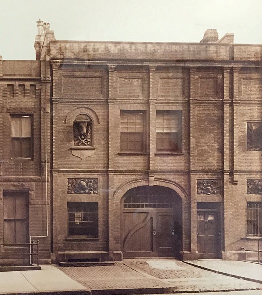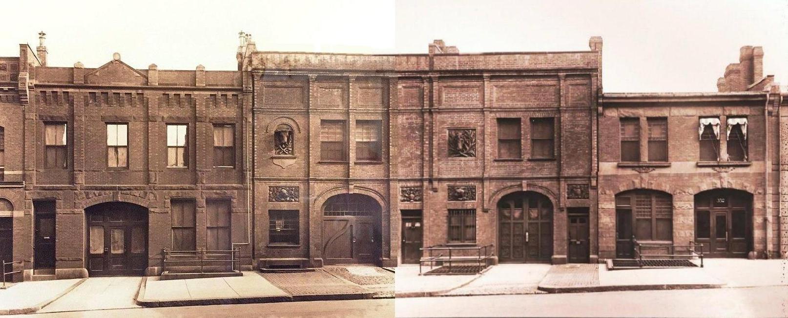 348 Newbury was designed by Bradlee and Winslow and built in 1881 by Vinal & Dodge (Warren D. Vinal and Charles A. Dodge), masons, as a two-story plus basement brick stable and dwelling with a 25 foot frontage, one of two built at the same time in the same design (348-350 Newbury; 350 Newbury was demolished and replaced in 1915). As originally built, each stable had terra cotta animal heads on the eastern portion of the front façade, a cow and dog at 348 Newbury and a horse and a dog ar 350 Newbury, with the two dogs facing so that they appeared to be looking at each other.