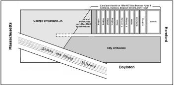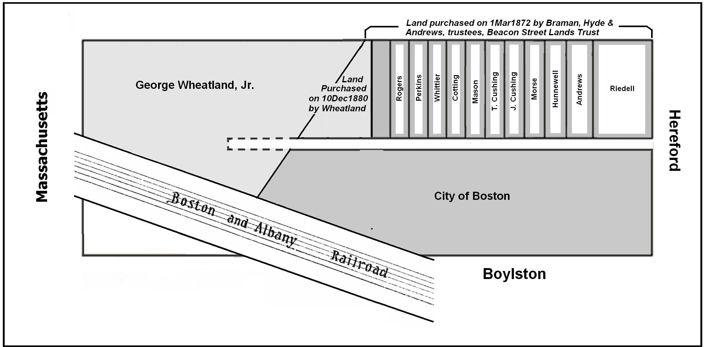 Between December 1 and December 10, 1880, real estate dealer George Wheatland, Jr., acquired the western portion of the block through a series of transactions. On December 10, 1880, he purchased the triangular lot at the boundary with the Beacon Street Lands Trust, with a frontage of 6.26 feet on Newbury, thereby creating a boundary perpendicular to Newbury 320.50 feet west of Hereford. The lots located at 320-340 Newbury and the eastern 19 feet of 342 Newbury were on land previously owned by the Trust. Six feet of the the lot at 342 Newbury and the lots at 344-360 Newbury were on land owned by George Wheatland, Jr.
