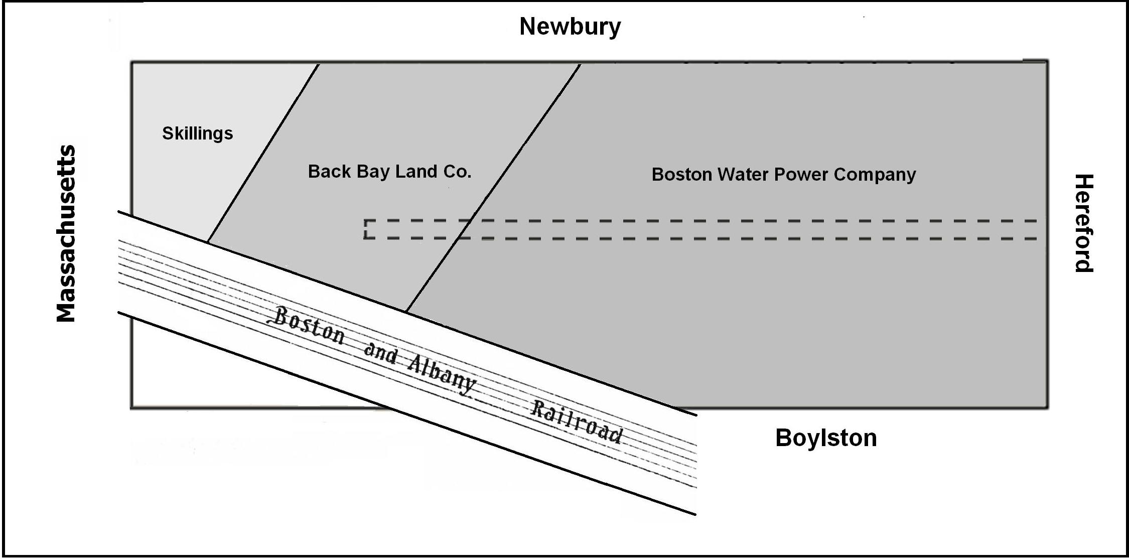 As of 1872, the eastern half of the land on the south side of Newbury between Hereford and Massachusetts Avenue (formerly West Chester Park) was owned by the Boston Water Power Company, with a frontage on Newbury of 326.76 feet. The western boundary ran southwest at a 45 degree angle to the Boston and Albany Railroad tracks and then south east from there to Boylston. The land to the west, running at a 45 degree angle southwest and with a frontage on Newbury of 177.16 feet was owned by the Back Bay Land Company (Russell A. Ballou, Constantine C. Esty, Oliver S. Sanford, Wilbur F. Claflin, and John S. Lamming, trustees), and the land west of that, with a frontage of 136.08 feet on Newbury, was owned by David N, Skillings.