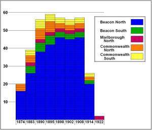 The number of private stables built in the residential portion of the Back Bay increased through the 1880s. Based on the insurance maps for the period, there were 56 private stables in the neighborhood by 1890, and that number remained relatively constant during the first decade of the twentieth century. The vast majority of the stables were located on the north side of Beacon, where the depth of the lots and the 30 foot width of Back Street were especially suitable to stable operations. By 1914, the automobile had supplanted the horse-and-carriage and many of the stables had been converted into automobile garages. By 1922, the Bromley map showed only two remaining stables, at 277 and 279 Marlborough, and even these probably were no longer really functioning as such (the 1914 Sanborn map, which is generally more accurate, indicates that 277 Marlborough had been converted into an automobile garage and 279 Marlborough had been converted into shed).