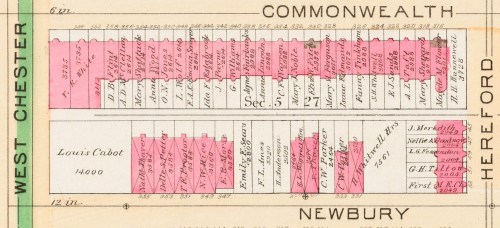 For example, in 1872 James B. Case received approval from the Board of Aldermen to build a stable behind his home at 120 Commonwealth. He did not build it immediately, however, and in 1880 he filed another petition, the previous approval presumably having lapsed. In the interim period, the houses across the alley on Newbury had been built and the owners objected to the stable. He subsequently built a storage building and then, in 1889, sought a license to from the Board of Health to operate it as a stable. After another round of controversy, his application was denied. Click here for further details.