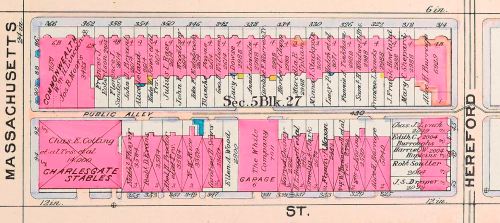 The lots on the south side of Beacon and on Marlborough and Newbury were 112 feet deep, too shallow to permit a stable in most cases. Only seven stables were built on the 112 foot deep blocks, all on the alleys between the south side of Beacon and the north side of Marlborough: at 343 Beacon and 277–279 Marlborough between Exeter and Fairfield, and at 403–405 Beacon and 413-415 Beacon between Gloucester and Hereford.
