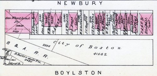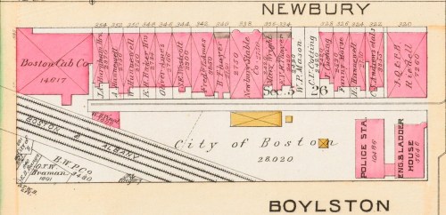 In 1886, a 50 foot wide club stable was built at 338 Newbury. Additional private stables were built on the remaining lots, with only two lots remaining vacant in 1890.