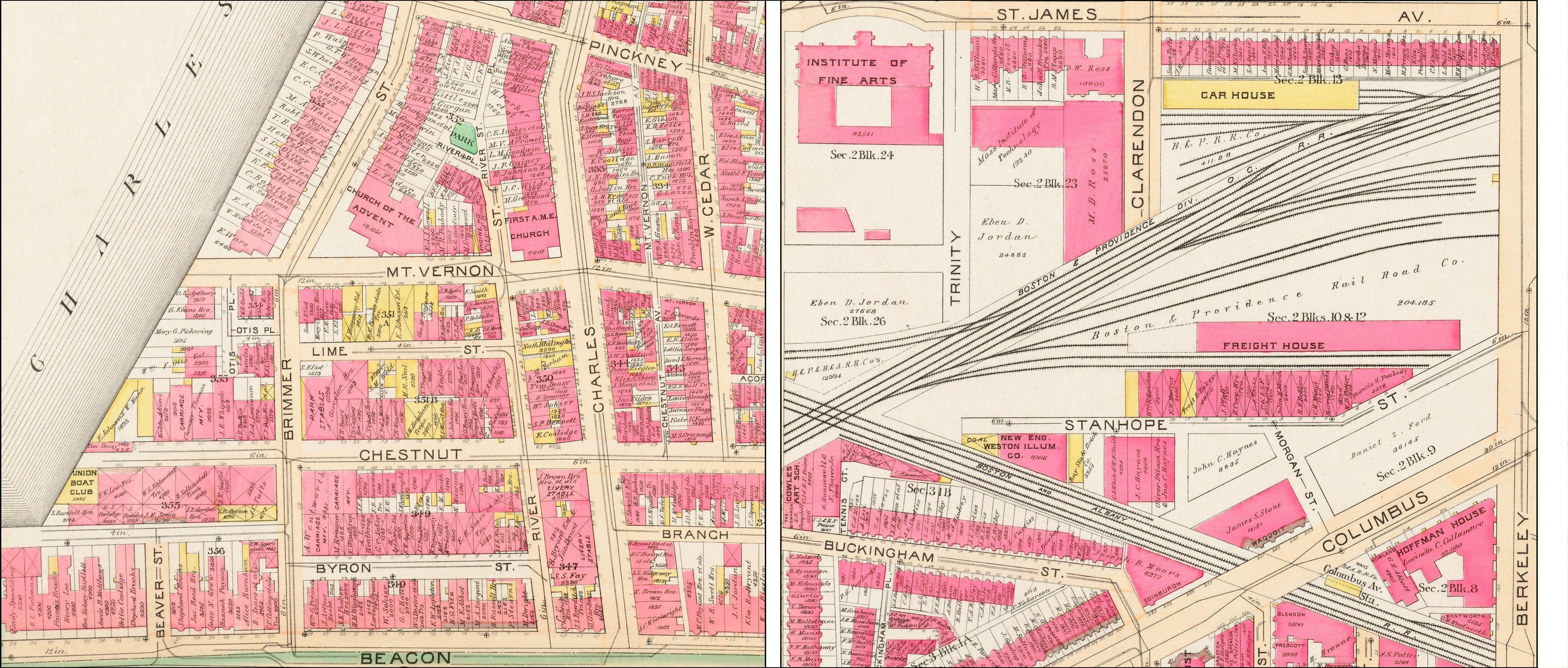 Near the eastern end of the neighborhood, a large number of private and commercial livery stables were built on the flat of Beacon Hill, west of Charles Street, between Mt. Vernon to the north and Byron on the south. This area was developed in the 1880s and, by 1890, had a large number of stables serving residents of both Beacon Hill and the Back Bay.