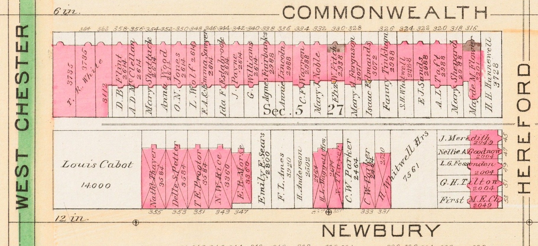 The north side of Newbury developed slowly because of concerns by those living across the alley on Commonwealth about the adverse impact of stables. Townhouses, not stables, were built on the northwest corner of Newbury and Hereford (45–47-49-51-53 Hereford). Private stables were first built primarily where houses had not yet been constructed across the alley on Commonwealth. By 1883, seven stables had been built, with all but one across from a vacant lot on Commonwealth.