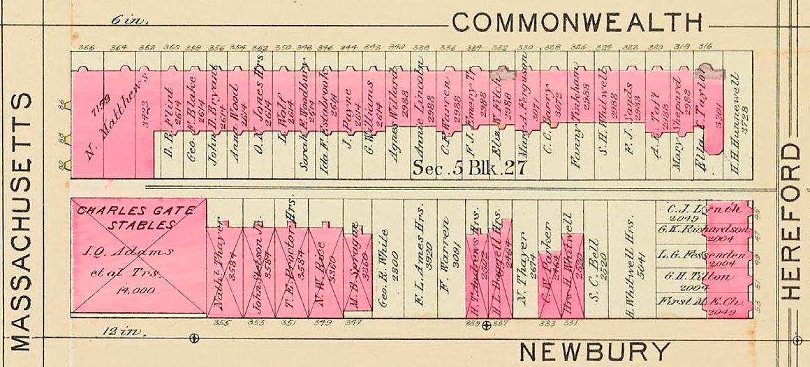 In 1886, a 50 foot wide club stable was built at 338 Newbury. Additional private stables were built on the remaining lots, with only two lots remaining vacant in 1890.