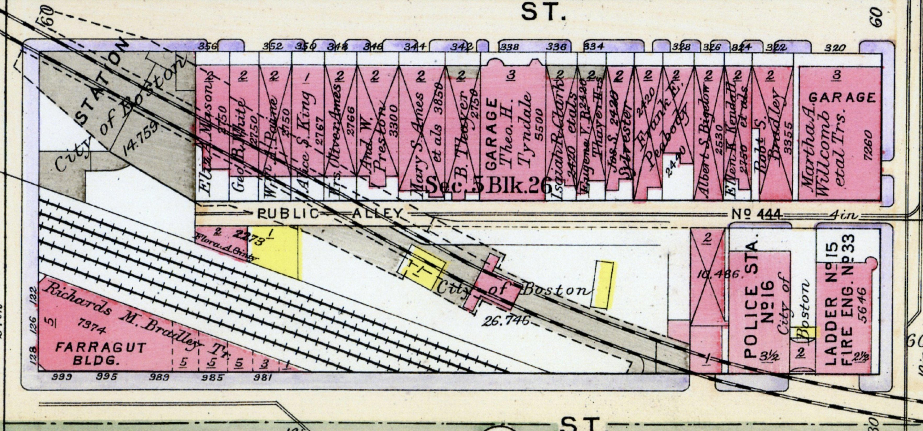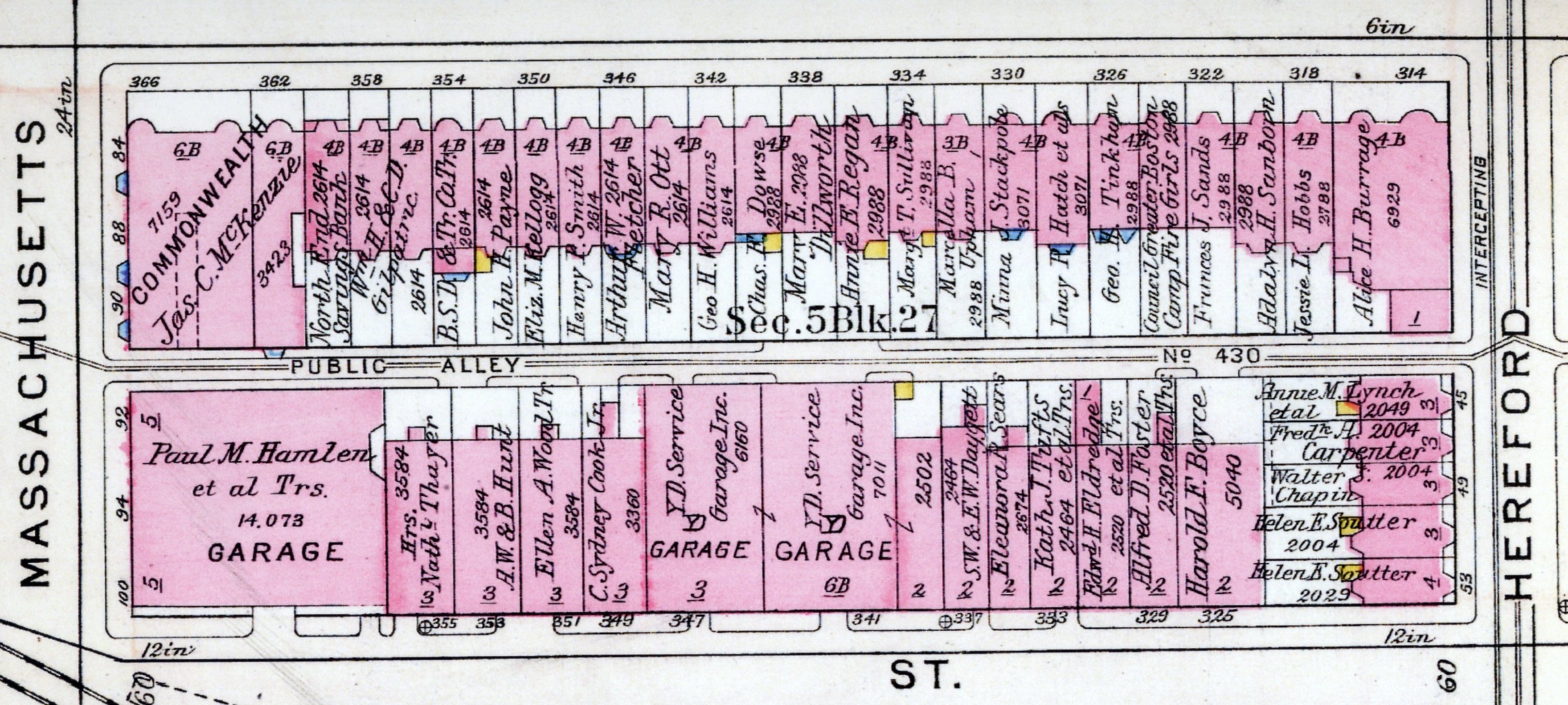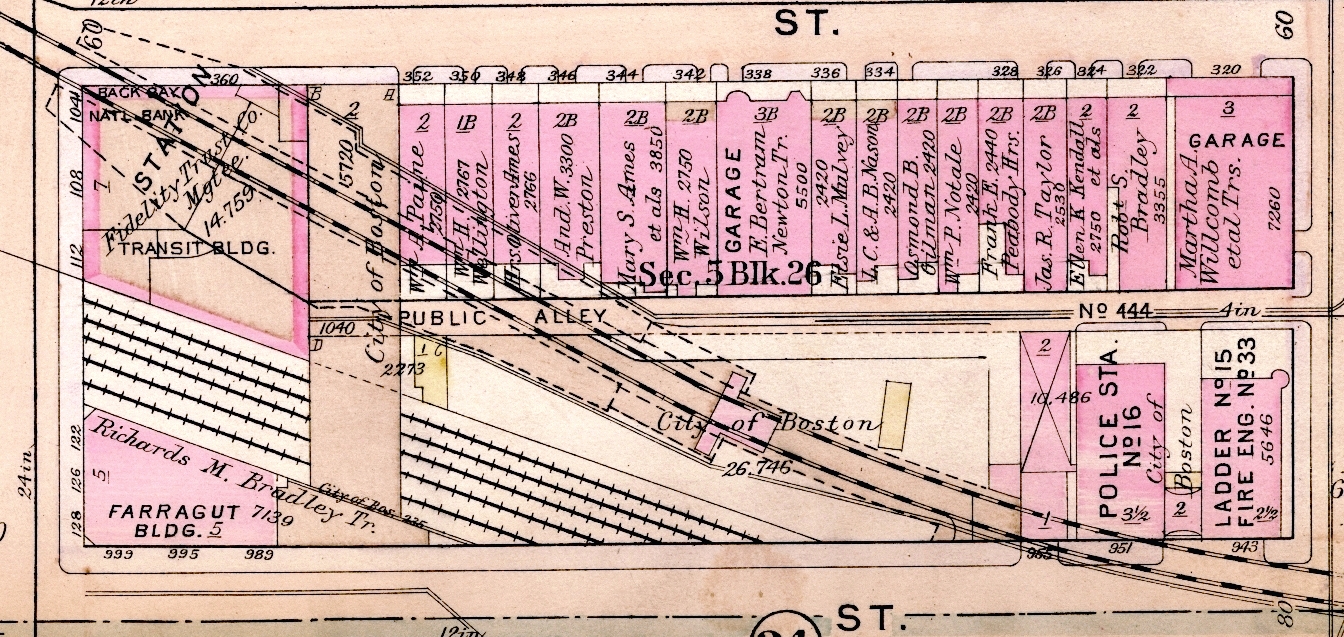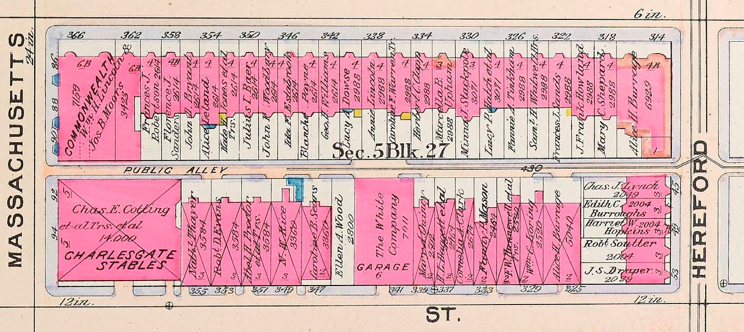 In 1913, the Boston Cab Company stable and garage at the southeast corner of Newbury and Massachusetts was acquired by the City of Boston and demolished in conjunction with construction of the Boylston Street subway and Massachusetts Avenue station.